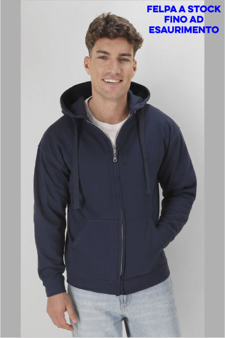 Classica Felpa Unisex in misto cotone con cappuccio e zip lunga, morbida al tatto ed estremamente comoda da indossare in ogni occasione.